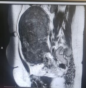 و بعد عمل الأشعة الصوتية و أشعة الرنين تبين وجود عدة أورام ليفية حميده تملىء تجويف البطن أكبرها بحجم اكثر من ٢٠ سنتيمترًا.