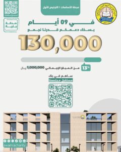 أعلنت جمعية العوامية الخيرية عن جمع 13% من المبلغ المستهدف للمرحلة الأولى من مشروع المبنى الإداري الجديد، وذلك خلال 9 أيام فقط من بدء الحفر في أرض المشروع ضمن المرحلة الأولى وهي مرحلة الاساسات والتي تبلغ تكلفتها الاجمالية مليون ريال أكتمل منها حتى الآن 130 الف ريال من خلال 90 متبرعاً، قدموا تبرعات كصدقة جارية لدعم استمرارية أعمال الجمعية.