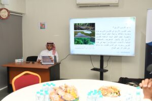 ثم تحدث آل رمضان عن الكربون الأزرق و النظم البيئية للكربون الأزرق و أماكن وجوده بالاضافة إلى فوائده ، والنظم الايكولوجية و أسباب تدهور النظام البيئي.