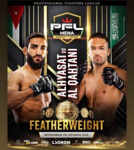 أعلنت رابطة المقاتلين المحترفين PFL MENA أن البطل السعودي عبد الله القحطاني سيواجه نظيره الأردني عبد الرحمن الحياصات في نهائي وزن الريشة لبطولة الفنون القتالية المختلطة لمنطقة الشرق الأوسط وشمال إفريقيا، المقرر إقامته يوم 29 نوفمبر المقبل بالعاصمة السعودية الرياض، جاء هذا النزال المرتقب بعد اضطرار اسلام رضا على الخروج من المنافسات بسبب انقطاع كامل في رباط الكاحل الذي تعرض له خلال التدريبات.