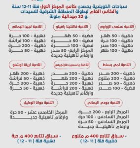 25- 26 / 10 / 2024م فقد حصدن المركز الاول وكأس فئة 11 – 12 سنة والكاس والدرع العام للبطولة و ( 32 ) ميدالية ملونة وأرقام تأهيلية جديدة ومراكز متقدمة جاءت على النحو التالي ( 28 ذهبية – 4 فضية )