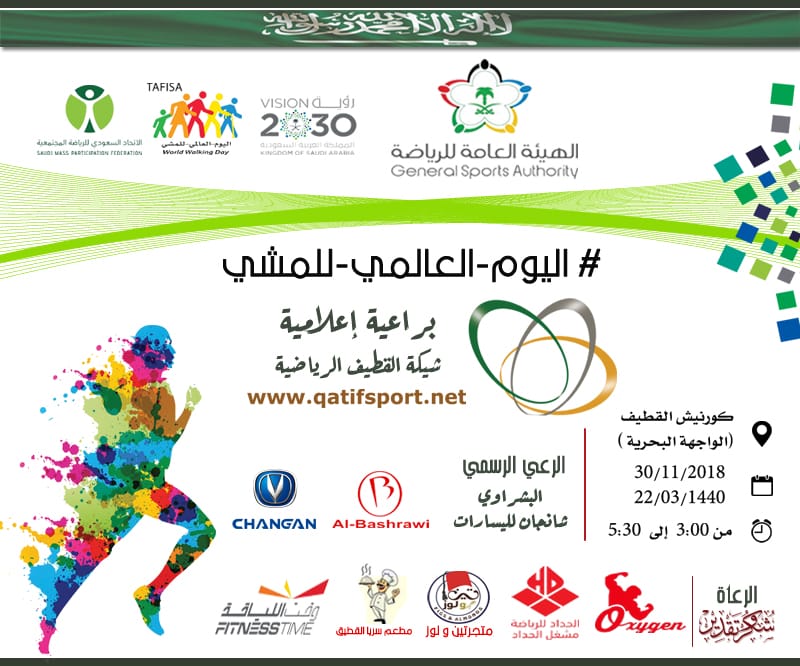 برعاية سعادة الأستاذ خالد بن عبد العزيز الصفيان محافظ القطيف وبحضور رؤساء الاندية وشخصيات رياضية واجتماعية، ينطلق عصر اليوم الجمعة في الساعة الثالثة والنصف بكورنيش القطيف ينظم مكتب ماراثون اليوم العالمي للسكر بتنظيم الهيئة العامة للرياضة بالقطيف وبرعاية إعلامية من شبكة القطيف الرياضية ماراثون اليوم العالمي للسكر في كورنيش القطيف وبمشاركة كافة شرائح المجتمع ( رجال- نساء – شباب – أطفال).