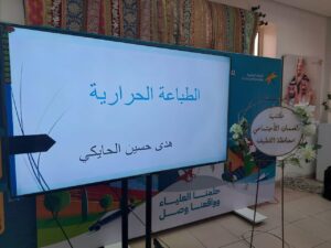 واستعرضت المدربة خلالها عدة محاور تتمثل في التعريف عن الطباعة الحرارية حيث عرفتها بعملية نقل الصور أو النصوص من ورقة خاصة إلى سطح آخر بواسطة الحرارة والضغط، وتطرقت إلى مستلزماتها وذكرت منها الأوراق والخامات المطلوب الطباعة عليها والحبر الخاص فيهم والماكينة والقوالب والمكابس وغيرها، كما نوهت عن أماكن شراء هذه المواد وتكلفة صيانتها، وتكلفة انشاء المشاريع ومجالات تطبيقاتها منها على سبيل المثال تصميم وإنتاج الأكواب والميداليات والدروع والملابس الرياضية وغيرها الكثير .