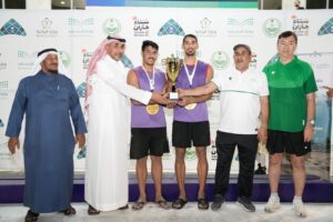 وسلم عضو مجلس ادارة الاتحاد السعودي للكرة الطائرة المشرف على البطولة الاستاذ محمد الفقيه الكأس والميداليات الذهبية لثنائي فريق الابتسام ضياء ال خواهر وحسن الكعيبي فيما حصل ثنائي فريق العلا ابراهيم المعقيل وسراج العمري على الميداليات الفضية