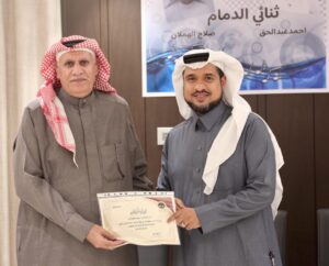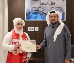 وبعدها قامت الدكتورة هنادي الهاجري بتقديم شهادة تقدير للشاعر أحمد عبدالحق تقديراً منها لما قدمه في ساحة الشعر .