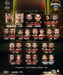 وفي ختام النزالات الرسمية، يواجه المقاتل السعودي أحمد مكي، الذي يمتد سِجله القتالي لستة وعشرين عاماً، نظيره المصري هشام النمر.