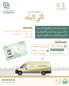 بالتعاون مع إدارة الأحوال المدنية، تستضيف جمعية العوامية الخيرية للخدمات الاجتماعية يوم الثلاثاء 22/7/2025، من الساعة 9 صباحًا وحتى 12:00 ظهرًا، خدمة الوحدات المتنقلة للأحوال المدنية، ضمن مبادرة «نأتي إليك» التي تنفذها وكالة وزارة الداخلية للأحوال المدنية للجهات الحكومية والخاصة.