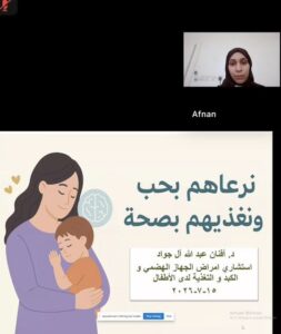 انطلقت الورشة الأولى تحت عنوان “نرعاهم بحب… ونغذيهم بصحة”، وقدمتها الدكتورة أفنان آل جواد، استشارية أمراض الجهاز الهضمي والكبد والتغذية لدى الأطفال. وتناولت الورشة مفاهيم التغذية السليمة للأطفال دون سن الخامسة، وأساسيات العناصر الغذائية الضرورية، إلى جانب التوعية بحساسية الطعام، وسبل الوقاية والإجراءات الواجب اتباعها في بيئات الحضانة لضمان سلامة الأطفال.