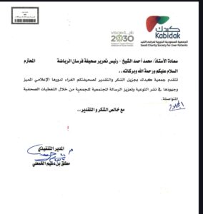 وجه المدير التنفيذي لجمعية كبدك بالقصيم، الأستاذ مطلق بن دغيم الخمعلي، اليوم الأثنين 21 يوليو ، خطاب شكر إلى رئيس صحيفة فرسان الرياضة، الأستاذ محمد بن أحمد الشيخ، تقديراً للدور الإعلامي المتميز الذي تقوم به الصحيفة لنشر الوعي وتعزيز الرسالة المجتمعية للجمعية من خلال التغطيات الصحفية المستمرة.