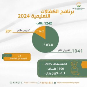 وشهد العام الماضي تخرج 22 طالبًا جامعيًا ضمن المستفيدين من البرنامج، في إنجاز يعكس مدى فعالية المبادرة وأثرها المباشر في تعزيز النجاح الأكاديمي والاستقرار التعليمي. حيث قدمت الجمعية خلال العام مساعدات تعليمية متنوعة لدعم الطلاب تضمنت مساعدات مالية للاحتياجات المدرسية، وللمواصلات وللسكن الجامعي، ولرسوم التعليم بميزانية قاربت 3 ملايين ريال كما سجلت الجمعية خلال النصف الأول 2025 مساعدات بلغت أكثر من 7 ملايين ريال، بينها 1.9 مليون ريال خُصصت مباشرة للتعليم.