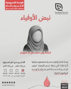 روان محمد علي آل صويملرحمها الله وأسكنها فسيح جناته، للتبرع بالدم؛ في مستشفى الأمير محمد بن فهد ،يوم الاثنين 8 سبتمبر 2025 ، عند الساعة 4:30م – 9:00 م