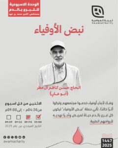 وفاءً وعرفانًا لرجلٍ حمل قلوب الأطفال بمحبةٍ وحنان، وظلّ سنواتٍ يخدم مجتمعه بإخلاصٍ في باص دار الطفولة لعقود، فأوصل أجيالًا صاروا اليوم أساتذة ومهندسين وطلاب علم، ومن هذا المنطلق تدعو لجنة التبرع بالدم بجمعية العوامية محبي المرحوم الحاج حسن كاظم أحمد آل مطر رحمه الله وأسكنه فسيح جناته، للتبرع بالدم ، في مستشفى الأمير محمد بن فهد ، يوم الاثنين 15 سبتمبر 2025