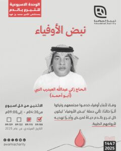 وفاءً لأبناء أوفياء خدموا مجتمعهم وتركوا أثرًا خالدًا، تأتي حملة “نبض الأوفياء” ليكون كل تبرع بالدم حياة لمريض وأجرًا نهديه لأرواحهم الطيبة ،ومن هذا المنطلق تدعو لجنة التبرع بالدم بجمعية العوامية، محبي المرحوم الحاج زكي عبدالله العبدرب النبي رحمه الله،للتبرع بالدم؛ في مستشفى الأمير محمد بن فهد ، يوم الاثنين 15 سبتمبر 2025