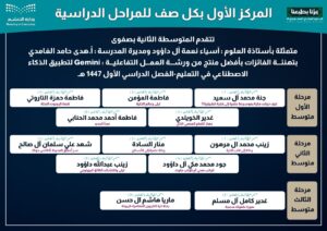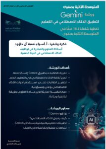 في خطوة مبتكرة لمواكبة التحول الرقمي، نفذت معلمة العلوم أ. آسياء نعمة آل داؤود ورشة عمل تطبيقية بعنوان، “Gemini والذكاء الاصطناعي في التعليم”