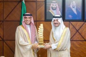 وقدّم الفوزان لسمو أمير المنطقة الشرقية عرضًا عن النسخة السابعة من المسابقة، التي شهدت نقلة نوعية على مستوى المشاركات والمخرجات الفنية، حيث تنوّعت الأعمال المقدّمة واتسمت المشاريع الفائزة بطابعها العالمي وعمقها الثقافي، مجسّدةً رؤية المشاركين وانطباعاتهم عن المكانة العالمية للمملكة وثراء ثقافتها وتطورها العمراني والفني، كما قدّم لسموه عرضاً عن مجسم “وحدة وطن” الذي يجسد رواية تحكي وقفات الملك عبدالعزيز – طيب الله ثراه – في انطلاق رحلة توحيد المملكة .
