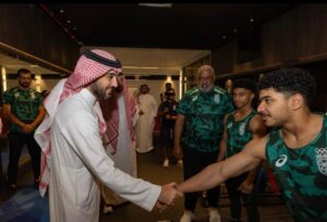 وطالب سموه خلال لقاءه باللاعبين واللاعبات، الظهور بمستوى مشرّف يعكس ما وصلت إليه الرياضة السعودية، من تطور كبير، بفضل الدعم السخي واللا مسبوق، الذي توليه القيادة الحكيمة – حفظها الله-، للقطاع الرياضي، نتج عنه ولادة مواهب سعودية واعدة تمثّل النواة الحقيقة للرياضة بالمملكة في الاستحقاقات المستقبلية.