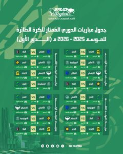 أعلنت لجنة المسابقات في الاتحاد السعودي لكرة الطائرة عن جداول مباريات بطولات الموسم الرياضي 2025–2026، والتي تشمل الدوري السعودي الممتاز، ودوري الدرجة الأولى، إضافة إلى بطولات الدوري الممتاز لفئتي الشباب والناشئين (A وB).