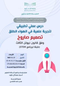 في أجواء مفعمة بالحماس وروح الاكتشاف، نفذت أستاذة العلوم آسياء نعمة آل داؤود يوم الأربعاء الموافق ٢١/ ٥/ ١٤٤٧ه درسًا عمليًا تطبيقيًا بعنوان “تصميم صاروخ وفق قانون نيوتن الثالث” لطالبات الصف الأول متوسط، وذلك في الساحة الخارجية للمدرسة المتوسطة الثانية بصفوى.