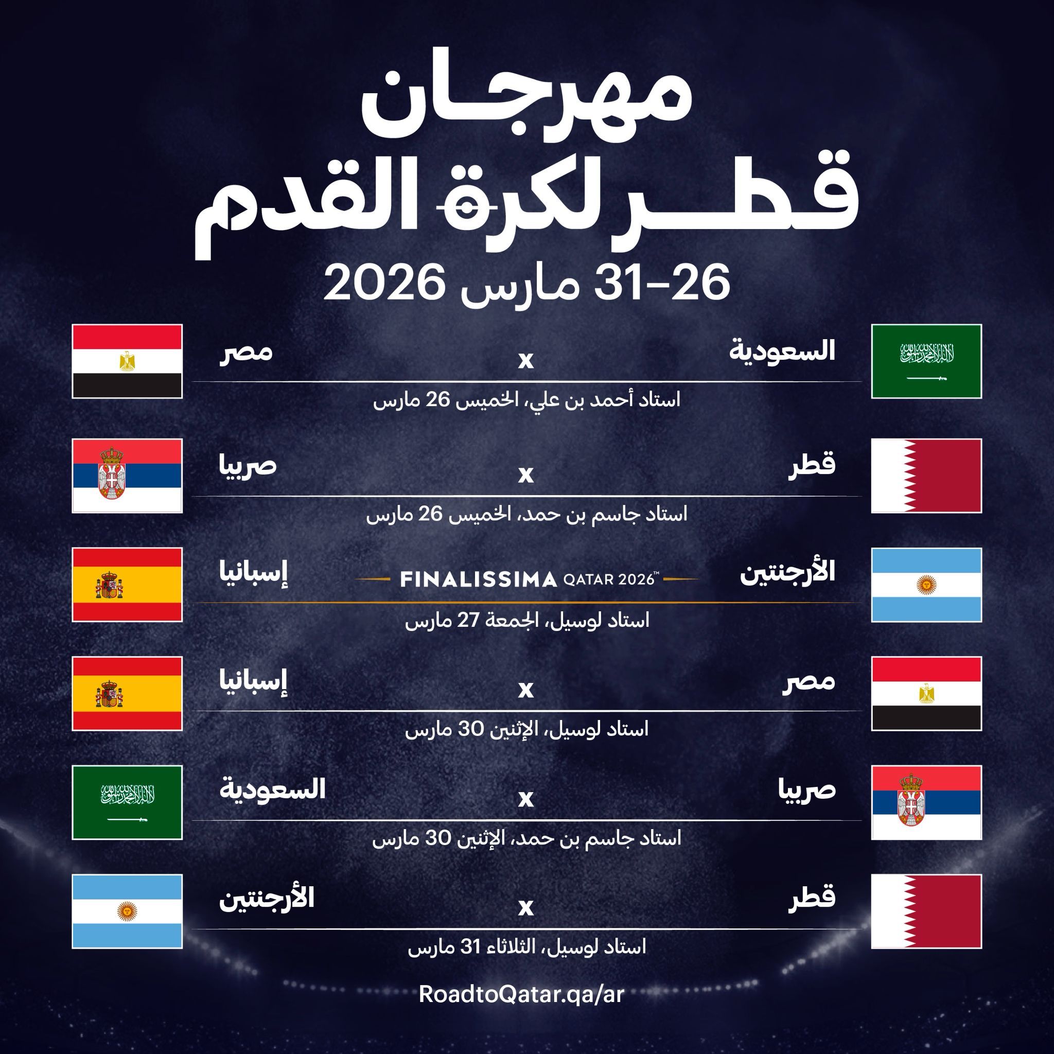 • 26 مارس: منتخب قطر أمام منتخب صربيا على استاد جاسم بن حمد
