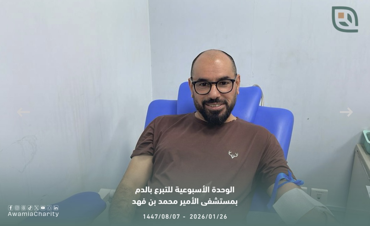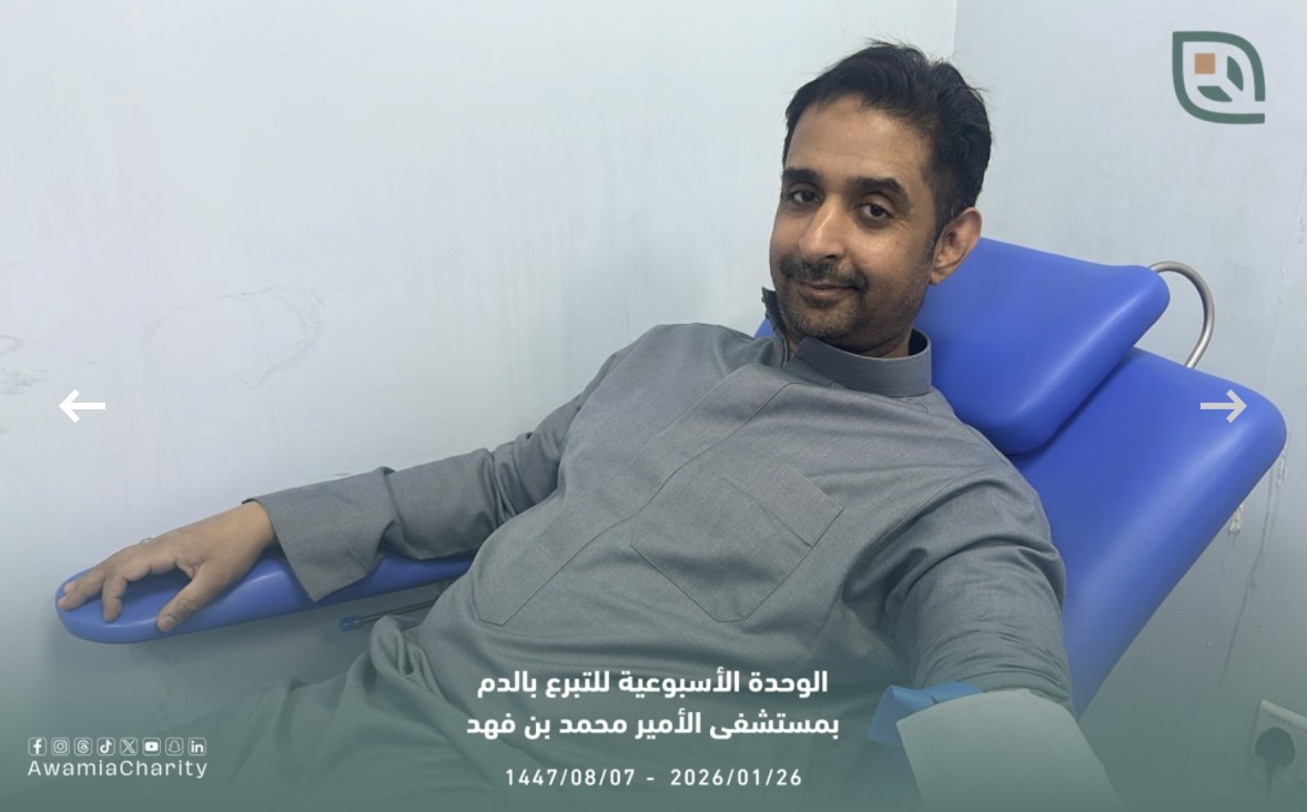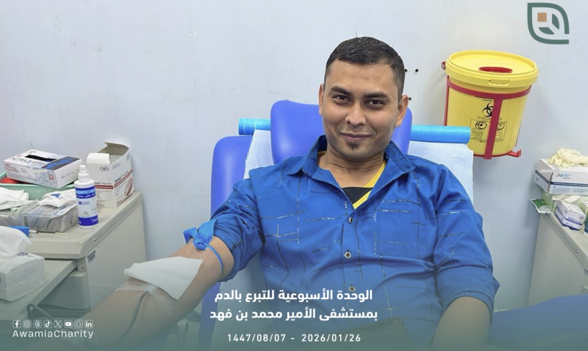 جمعت وحدة التبرع بالدم الأسبوعية بمستشفى الأمير محمد بن فهد العام والأمراض الوراثية، وضمن مبادرة لجنة الفعاليات والأنشطة بجمعية العوامية الخيرية، 21 وحدة دم، مساء يوم الاثنين الموافق 26-01-2026م.