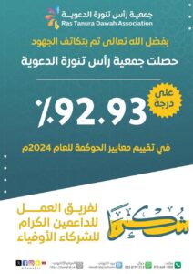 بحمد الله وتوفيقه، وبجهود مخلصة ومتكاملة، حققت جمعية رأس تنورة الدعوية إنجازًا متميزًا بحصولها على درجة (92.93%) في تقييم معايير الحوكمة لعام 2024م، وهو ما يعكس التزام الجمعية بتطبيق أعلى معايير الشفافية والحوكمة المؤسسية، وحرصها على جودة الأداء الإداري والتنظيمي.