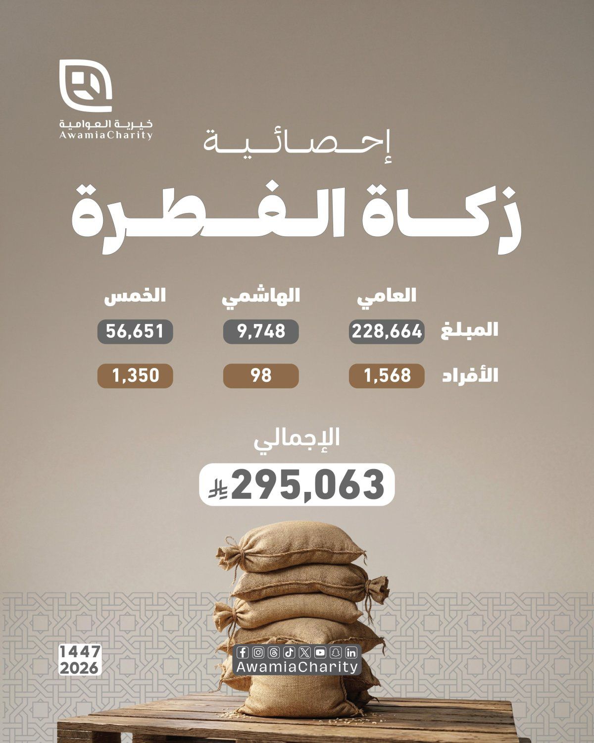 سجّلت خيرية العوامية ارتفاعًا ملحوظًا في إجمالي مبالغ زكاة الفطرة لعام 1447هـ (2026م)، حيث بلغت 295,063 ريالًا، مقارنة بـ253,267 ريالًا في العام الماضي 1446هـ، بزيادة قدرها 41,796 ريالًا، تمثل نموًا بنسبة 16.5% على أساس سنوي، مدفوعا بتسهيل الجمعية لوسائل الدفع بطرق متنوعة تسهل على جميع المكلفين دفع زكاتهم بالطريقة الأيسر والأسهل لهم.