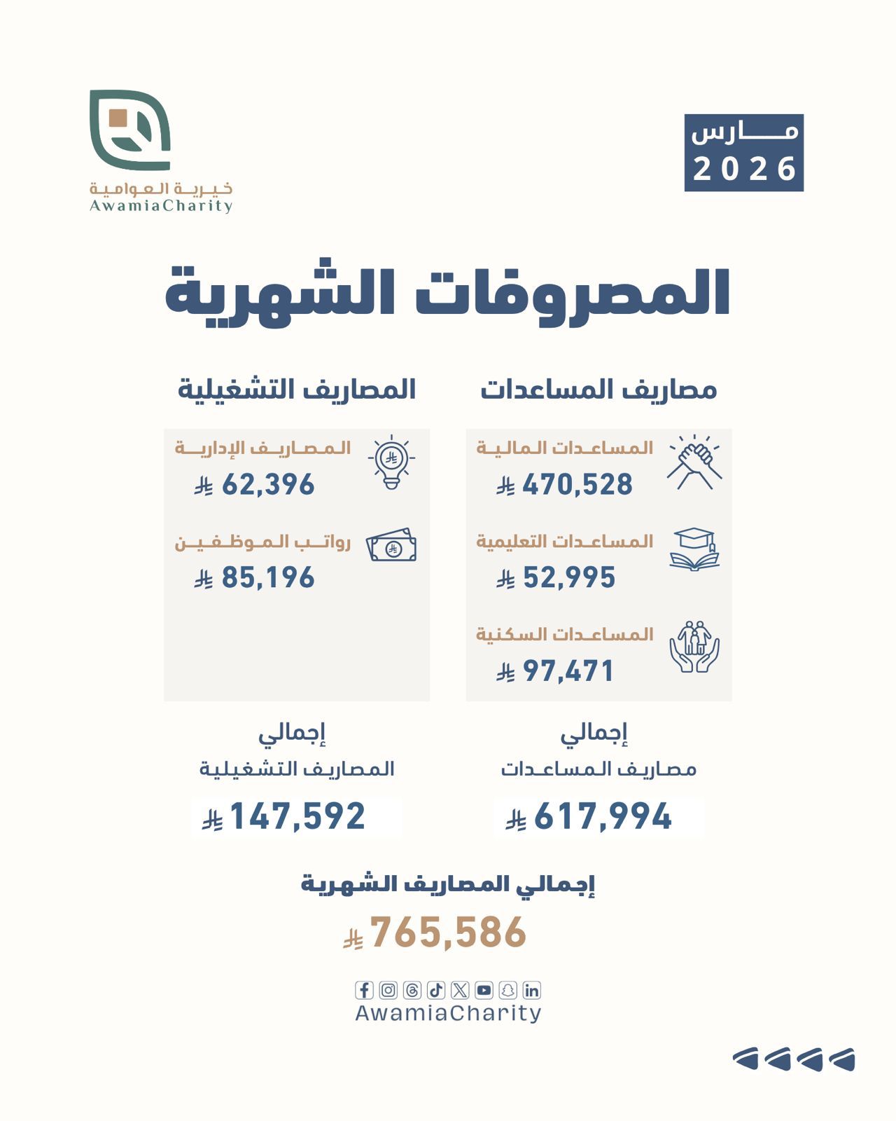 أقرّ مجلس إدارة جمعية العوامية الخيرية، برئاسة المهندس حسن عبدالله آل لباد، المصروفات المالية لشهر مارس 2026م، بإجمالي بلغ 765,586 ريالًا، وذلك ضمن التقارير الشهرية والتزام الجمعية بالشفافية المالية وتعزيز كفاءة توجيه الموارد بما يحقق اهداف الجمعية.
