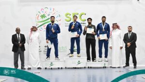 في حين تُوّج محمد العمرو (النجمة) بالميدالية الذهبية، في منافسات سلاح السيبر ، ونال مشاري البشير (الهلال) الفضية، فيما حصد علي الهاشم (العمران) البرونزية، وحقق عمر دويدار (العلا) المركز الثالث مكرر.