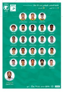 وضمّت القائمة (23) لاعبًا، جاءت أسماؤهم على النحو التالي: نواف العقيدي، عبدالرحمن الشمري، عبدالرحمن الصانبي، حمد اليامي، نواف بوشل، خليفة الدوسري، وليد الأحمد، جهاد ذكري، مشعل الصبياني، متعب الحربي، مهند الشنقيطي، إبراهيم محنشي، منصور البيشي، حامد الغامدي، بدر منشي، تركي العمار، حسين العيسى، عبدالمحسن القحطاني، هيثم عسيري، خالد الغنام، عبدالله رديف، محمد مران، وعبدالله الحمدان.
