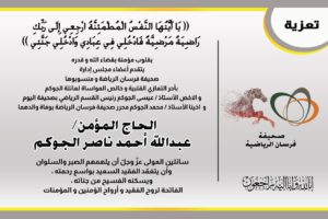 اسرة وأعضاء صحيفة الفرسان الذي ألم بها نبأ هذا الخبر تعزي عائلة الجوكم في وفاة والدهم سائلين المولى عز وجل ان يتغمده بواسع رحمته ويسكنه الفسيح من جنته وإنا لله وإنا إليه راجعون.
