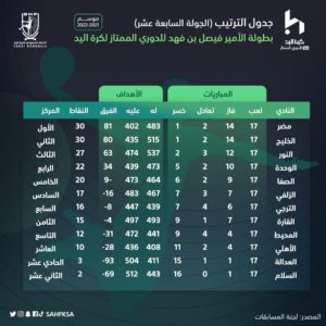 واصل فريقا مضر والخليج صدارتهما لترتيب بطولة الأمير فيصل بن فهد لأندية الدوري الممتاز لكرة اليد، بعد أن رفعا رصيدهما النقطي إلى 30 نقطة، بفوزهما اليوم الثلاثاء في مباريات الجولة السابعة عشر، إذ حقق مضر الانتصار على القارة بنتيجة (26-33)، وكسب الخليج نظيره الترجي بنتيجة (34-27).