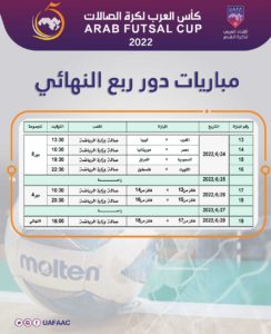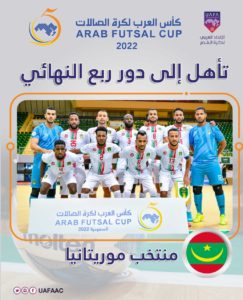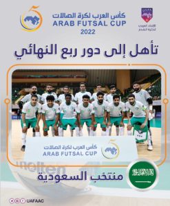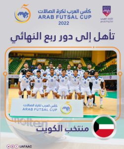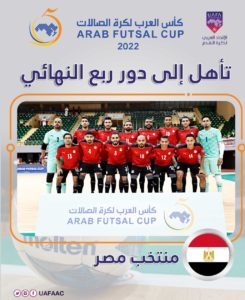 وتأهلت منتخبات المغرب والكويت وموريتانيا ومصر والعراق والسعودية وفلسطين وليبيا إلى الدور ربع النهائي لبطولة كأس العرب لكرة قدم الصالات 2022، التي ينظمها الاتحاد العربي لكرة القدم وتقام في صالة وزارة الرياضة بمدينة الدمام في المملكة العربية السعودية، خلال الفترة من 20 إلى 28 يونيو الحالي.