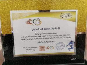 احتفت ادارة صحيفة فرسان الرياضة برئاسة الاستاذ محمد الشيخ وبحضور المستشار الاعلامي الاستاذ حسين كاظم بتكريم الزميلة عائشة العتيبي نظير الجهود الكبيرة والتغطيات الميدانية التي قامت بها ولا تزال خلال عملها الاعلامي في صحيفة فرسان الرياضة متمنين لها المزيد من التوفيق..