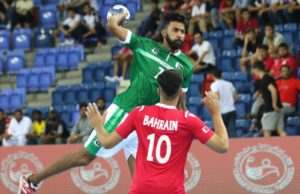 وانتهى الشوط الأول لمصلحة الأحمر البحريني بنتيجة ( 27/13) بعد أداء متفاوت لم يوفق الفريق في بدايته وأضاع العديد من الفرص والأهداف السهلة أمام المرمى الباكستاني كما أن الأخطاء الفنية المتكررة كلفت الفريق التأخر في النتيجة بفارق هدفين في بادئ الأمر (5/3) قبل أن يعيد الجهاز الفني ترتيب الأوراق من جديد بإجراء عدد من التغييرات التي أعطت المنتخب البحريني أفضلية السيطرة على مجريات الشوط وانهائه لصالحه بفارق مريح.
