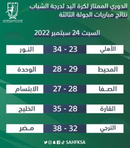 واصلت أندية النور ومضر والخليج انتصاراتها وحصدها العلامة الكاملة بواقع 6 نقاط، بعد ختام مباريات الجولة الثالثة من منافسات بطولة الدوري الممتاز لكرة اليد لدرجة الشباب للموسم الرياضي 2022-2023م، والتي جرت مساء اليوم السبت 24 سبتمبر 2022م، بإقامة خمس مواجهات في نفس التوقيت.