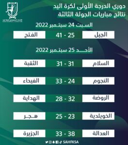 واصل فريقا الفتح والروضة انتصاراتهما في بطولة دوري أندية الدرجة الأولى لكرة اليد للموسم الرياضي 2022-2023م، بامتلاكهما العلامة الكاملة بواقع 6 نقاط، في ختام مباريات الجولة الثالثة اليوم الاحد 25 سبتمبر 2022م.