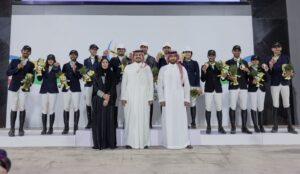 تّوج صاحب السمو الأمير فهد بن جلوي بن عبد العزيز بن مساعد، نائب الرئيس، الأمين العام للجنة الأولمبية والبارالمبية السعودية، مدير دورة الألعاب السعودية، وصاحبة السمو الملكي الأميرة دليّل بنت نهار بن عبدالعزيز، مستشار سمو نائب الرئيس، الأمين العام للجنة الأولمبية والبارالمبية السعودية، نائب مدير دورة الألعاب السعودية، بحضور صاحب السمو الأمير عبدالله بن فهد بن عبدالله رئيس مجلس إدارة الاتحاد السعودي للفروسية، الفائزين والفائزات بمنافسات قفز الحواجز والتي اختتمت منافساتها اليوم في نادي الفروسية بالجنادرية.