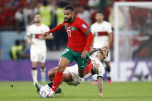وسدد لاعب منتخب المغرب حكيم زياش كرة في الدقيقة (18) مرت بعيدة عن مرمى حارس البرتغال.