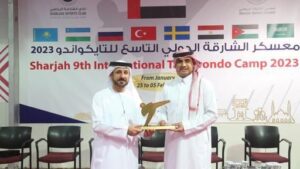 و الأستاذ سليمان عبدالرحمن الهاجري رئيس نادي الشارقه للألعاب الفردية وتم خلال الزيارة تبادل الدروع التذكارية احتفاءً بهذه المناسبة متمنياً “العمري” لدولة الإمارات الشقيقة التوفيق في تنظيم هذين المحفلين على الصعيد العربي والدولي ..