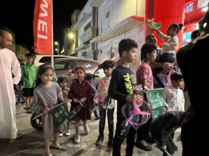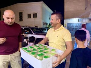 ووزع الشطي الحلوى والفواكه والهدايا والأعلام على الحضور والمارة احتفالا بهذه المناسبة ، وهذه ليست المرة الأولى التي يشارك فيه (أبو إبراهيم ) أهالي تاروت مناسباتهم و افراحهم ففي كل مناسبة تجده يبادر لإسعاد الجميع وخاصة ابناء تاروت .