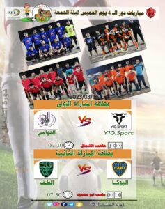 وبالتالي الحوامي سيقابل Y10Sport في اللقاء الاول بينما الطف سيوجه البوكا في اللقاء الاخر في دور الاربعة اليوم الخميس في تمام الساعة السابعة والنصف مساءً