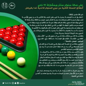 تنطلق غداً الجمعة بمدينة الرياض النسخة الثانية من دوري الأندية للسنوكر لدرجة الكبار وكذلك درجة الناشئين لموسم 2023 بمشاركة 11 نادي ويقام الدوري بنظام الجولات حيث ستقام اربع جولات في الموسم ستكون الجولة الاولى التي تنطلق غدا على صالة سنوكر سنتر بمدينة الرياض فيما تقام الجولة الثانية بمدينة جدة والجولة الثالثة بمدينة الرياض ويختتم الدوري بعد الجولة الرابعة بمدينة جدة .