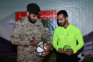 الاستاذ / عمار الخان.( شركة أوفسايد ) الاستاذ / فؤاد الغامدي. ( كنافة مختص ) وقد جمعت المباراة النهائية فريقي قيادة المجموعة وكتيبة 118 وشهدت مجريات اللقاء اثارة ومنافسة قوية لتحقيق اللقب وانتهت المباراة بفوز فريق قيادة المجموعة بنتيجة (٢-١) وقد صاحب الحفل عدد من العروض التدريبية من أبناء أكاديمية المجمع السكني للمجموعة الخامسة ( التايكوندو – رفع الأثقال ) وفي الختام توج اللواء الركن خالد بن سعيد أبو قيس فريق المجموعة بطل الدوري الرمضاني بالكأس والميداليات الذهبية وسلم فريق الكتيبة 118 الميداليات الفضية كما تم كريم الداعمين والرعاة وضيوف الحفل وقادات الوحدات.