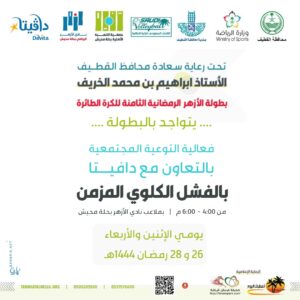 ضمن بطولة الازهر الرمضانية الثامنة للكرة الطائرة ستقام فعالية (التوعية المجتمعية بالفشل الكلوي المزمن ) ، بالتعاون مع “دافيتا ”
