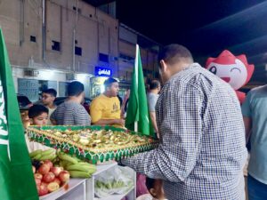وتحدث أ. محمد فخري مشرف شركة الحداد في المنطقة الشرقية : نحن متواجدون الليلة مع أبو إبراهيم كعادة نشاركه في الفعاليات المختلفة مثل العيد واليوم الوطني ويوم التأسيس ، وابو إبراهيم كريم مع أهل المنطقة وكل عام والشعب السعودي بخير .