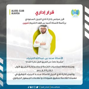قرر مجلس إدارة نادي الجيل السعودي برئاسة الأستاذ أحمد بن فهد الغنيم تعيين الاستاذ سعد بن عبدالله النينياء “مشرفاً عاماً على الفريق الأول لكرة القدم” ومنحه كافة الصلاحيات اللازمة لإعداد وإدارة الفريق الأول لكرة القدم.