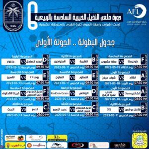 تفتتح مساء اليوم الثلاثاء 19 شوال 1444هـ دورة النخيل السادسة بالربيعية بمحافظة القطيف بمباراة واحدة ضمن لقاءات المجموعة السادسة بين فريقي باوليستا وسلة مشروب عند الساعة (8:00) مساءً