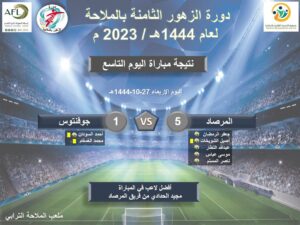 ضمن منافسات دورة الزهور الثامنة بالملاحة والتي تقام على الملعب الترابي، أقيمت عصر الاربعاء والخميس 27 و 28 شوال 1444هـ مبارتين، الاولى بين مرصاد سيهات والذي تفوق بخمسة أهداف مقابل هدف على جوفنتوس العوامية ليضمن المرصاد التاهل لمربع الكبار ولا يزال ابناء عوام في انتظار نتائج الجولة الاخير لمباريات المجموعة الاولى بين تشلسي سيهات وفريق المرحوم ناصر الذي سوف يحدد الطرف الثاني المتأهل للدور الثاني.