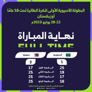 خسر المنتخب السعودي لكرة الطائرة للبراعم اخر لقاءاته أمام منتخب منغوليا في البطولة الآسيوية الأولى للكرة الطائرة تحت 16 عام و التي اقيمت في الفترة (22-29) يوليو في العاصمة الاوزبكية طشقند .
