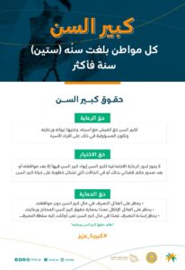 وتهتم المملكة بحقوق كبار السن اهتماما كبيرا حيث صدر المرسوم الملكي رقم ( م/ ٤٧) في عام ١٤٤٣ هـ بما يحفظ كرامتهم وخصوصيتهم واستقلاليتهم وكذلك يوفر لهم الرعاية والخدمات إيمانا ووفاء لهم .